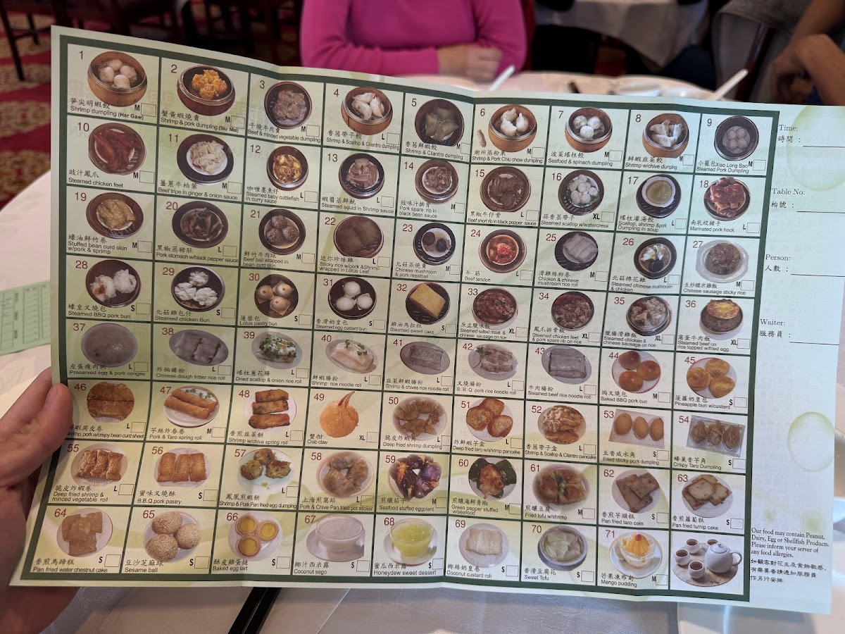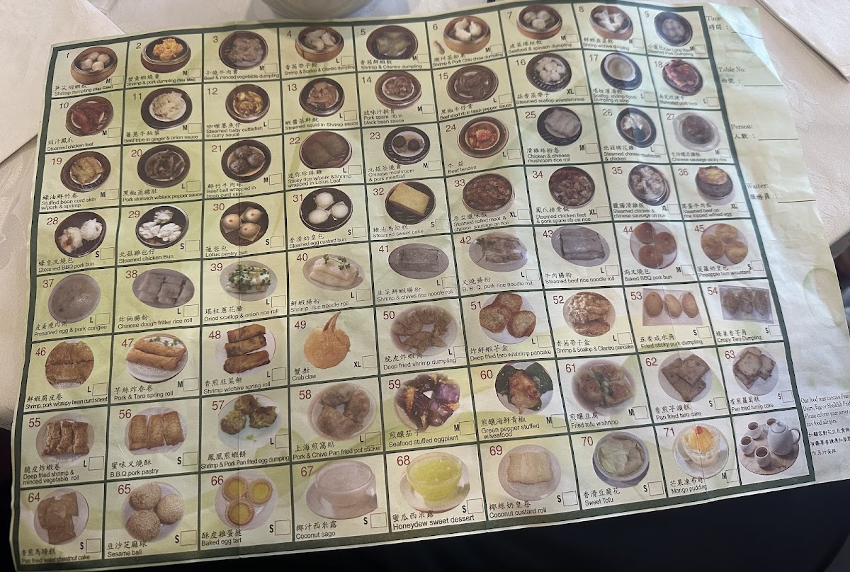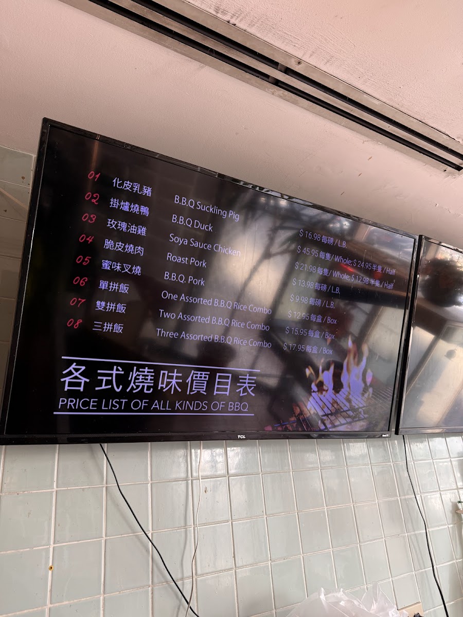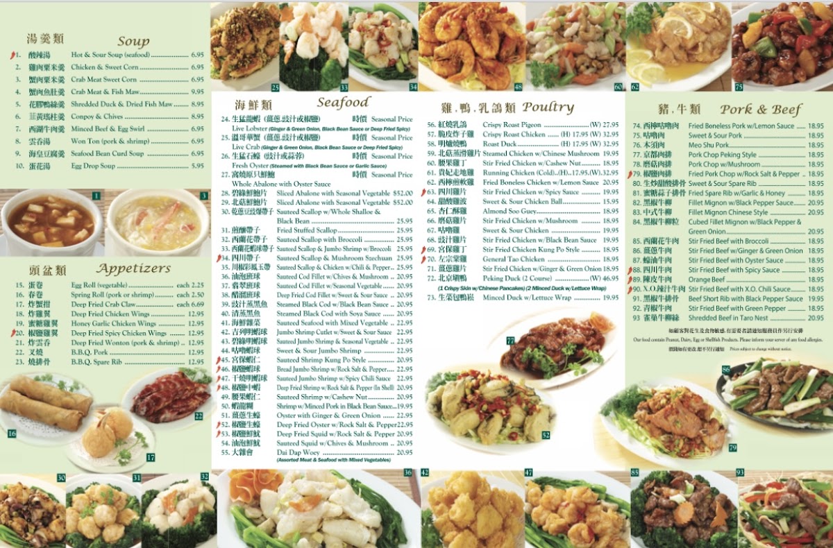 Spring rolls, deep-fried wontons, beef curry, chicken kung po style, chicken chop suey chow mein, barbeque pork and shrimp fried rice